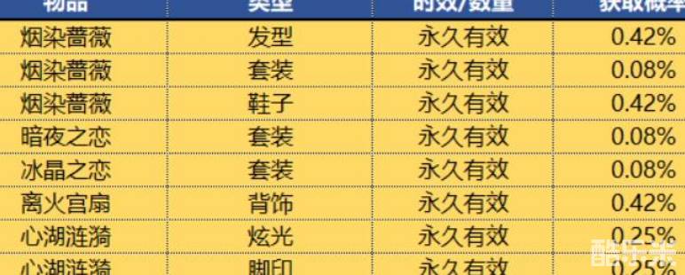 2、每次开启挚爱典藏服饰箱都可随机获赠一种游戏奖励,奖励内容以及对应的获取概率如下所示: