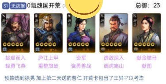 零氪阵容推荐:徐晃曹仁王异。适合卡包抽到王异,预选徐晃的朋友。
