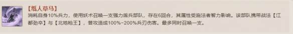 消耗自身10%兵力,使用妖术召唤一支强力盾兵部队,存在6回合,其属性受施法者智力影响。该部队携带战法【江都劲卒】与【北地枪王】,普攻造成100%~200%兵刃伤害。最多同时召唤一支。