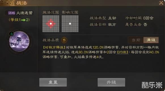 对敌军单体造成60%~120%谋略伤害,并对目标方形一格内敌军连续传递火焰,造成40%~80%谋略伤害和2回合【灼烧】:每回合受到20%~40%谋略伤害,可叠加。火焰最多传递4次。