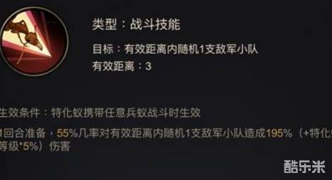 5.弱点打击技能:有效距离为3随机1支敌军小队,35%几率造成125%伤害(+驾驶员行军蚁等级*5%)伤害,并造成虚弱效果伤害降低20%持续1回合。,满级后35%几率对有效距离内随机1支敌军小队造成170%伤害。
