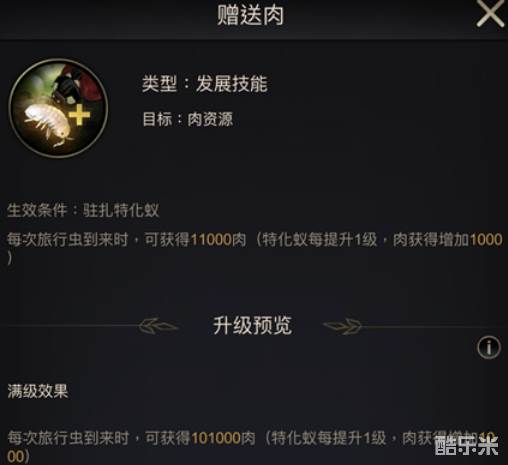 2.赠送肉技能,技能目标为肉资源,每次旅行虫到来时可获得11000肉,钝刺蚁每提升1级,肉获得增加1000。满级时旅行虫到来时可获得101000肉。