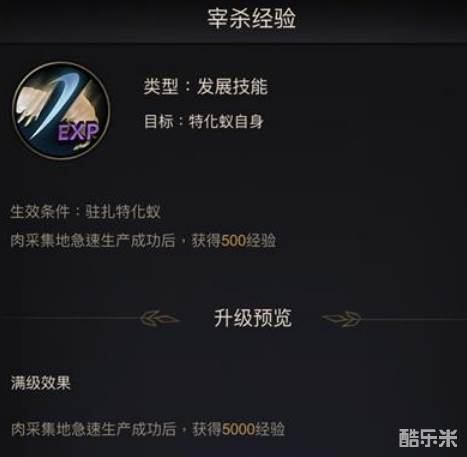 2.培育饵料技能,技能目标为肉采集地,盾切蚁驻扎后每个肉采集地产量增加100/小时,盾切蚁满级后肉采集地产量增加1000/小时。