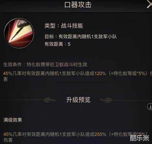 仿蚁虫是擅长率领近卫蚁远距离战斗的特化蚁。技能最大特色是攻击范围远,命中概率高,且有一定压制效果。在战斗初始阶段建议先使用压制攻击技能,距离攻击范围4可以轻松打击中排和后排的兵蚁,有30%机会可以造成140%伤害,并使攻击目标进入压制状态无法行动一回合。