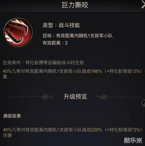 2.巨力撕咬技能,巨力撕咬技能目标为距离2内随机1支敌军小队,40%几率造成166%(+铁甲蚁等级*2%)伤害,满级后随机1支敌军小队,40%几率造成229%(+铁甲蚁等级*2%)伤害。