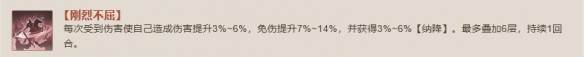 每次受到伤害使自己造成伤害提升3%~6%,免伤提升7%~14%,并获得3%~6%【纳降】。最多叠加6层,持续1回合。