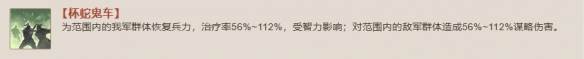 为范围内的我军群体恢复兵力,治疗率56%~112%,受智力影响;对范围内的敌军群体造成56%~112%谋略伤害。