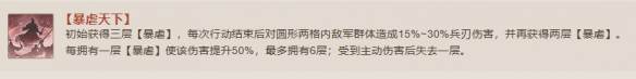 始获得三层【暴虐】,每次行动结束后对圆形两格内敌军群体造成15%~30%兵刃伤害,并再获得两层【暴虐】。每拥有一层【暴虐】使该伤害提升50%,最多拥有6层;受到主动伤害后失去一层。