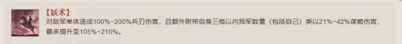 对敌军单体造成100%~200%兵刃伤害,且额外附带自身三格以内我军数量(包括自己)乘以21%~42%谋略伤害,最多提升至105%~210%。