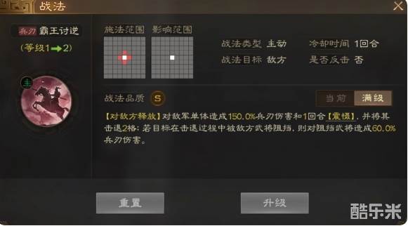 对敌军单体造成82%~164%兵刃伤害和1回合【震慑】,并将其击退2格;若目标在击退过程中被敌方武将阻挡,则对阻挡武将造成41%~82%兵刃伤害。