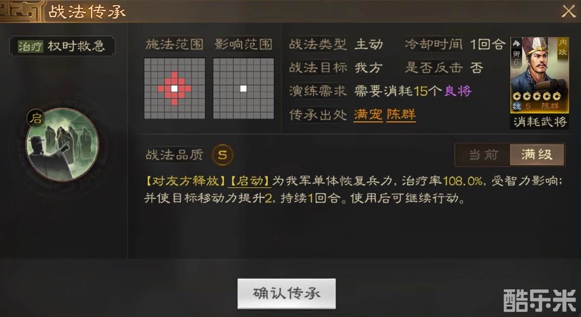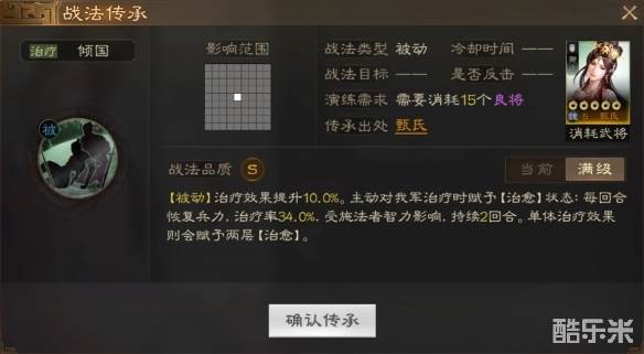 [被动]治疗效果提升10.0%。主动对我军治疗时赋子[治愈]状态:每回合恢复兵力。治疗率34.0%,受施法者智力影响,持续2回合。单体治疗效果则会赋予两层[治愈]。
