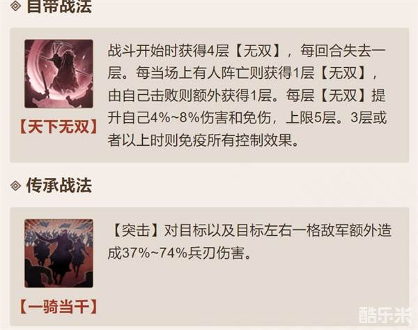 2:吕布自带的战法为天下无双和一骑当千,吕布作为三国中战力最强的存在,游戏中自然也是不弱的,单体输出能力超群;