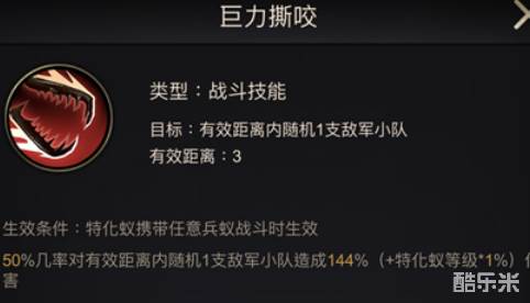 3.狂乱攻击技能:当白环蚁携带任意兵蚁后在有效距离4内随机2支敌军小队造成118%伤害(+白环蚁等级*0.5%),满级后造成136%伤害(+白环蚁等级*0.5%)