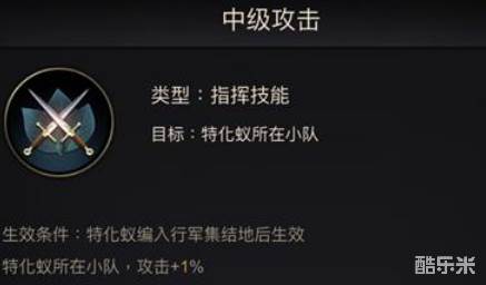 2.中级攻击、中级防御技能,跟橙色特化蚁不同,紫色特化蚁只有中级攻击和防御,目标为白环蚁所在小队,可使所在小队的蚂蚁攻击防御增加1%,满级后攻击防御增加10%。而高级的攻击和防御可以提升3.5%,满级后增加35%。可见中级和高级的差别还是很大的呦。