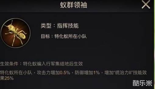 5.蚁群领袖技能,将橙色牛蚁编入行军集结地后生效,可使橙色牛蚁所在小队防御力增加1%,增加统治力II技能效果25%、攻击力增加0.5%。满级后攻击防御力增加10%,统治力II技能效果250%,攻击力增加5%。