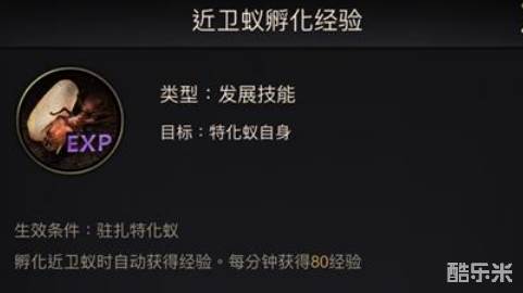 2.近卫蚁快速成长技能,平头龟蚁驻扎后近卫蚁孵化速度提升2.5%,随着平头龟蚁等级提升孵化速度也相应提升,平头龟蚁满级时近卫蚁孵化速度提升25%。
