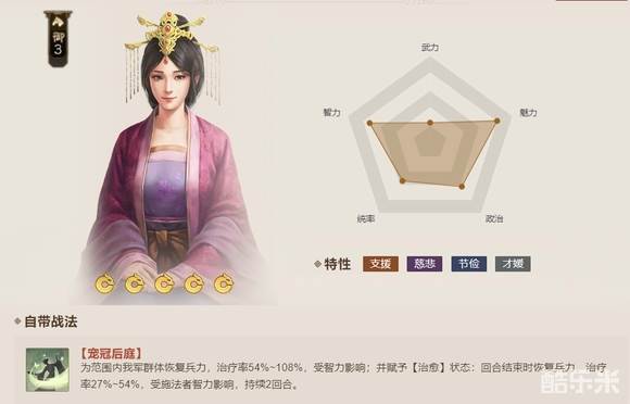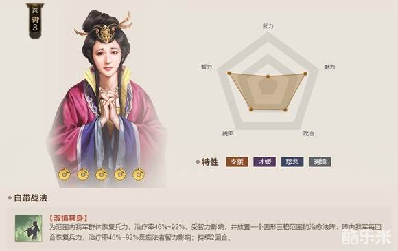 和甘氏一样,三维属性都是治疗武将里垫底的存在,蔡文姬起码智力还稍微好点