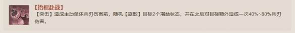 【突击】造成主动单体兵刃伤害前,随机【驱散】目标2个增益状态,并在之后对目标额外造成一次40%~80%兵刃伤害。