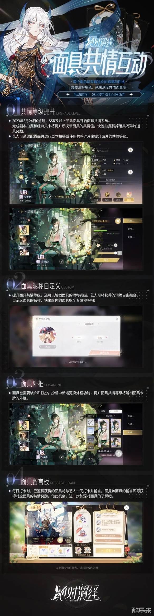 现在,《绝对演绎》又推出了新的玩法,让玩家进一步沉浸式地了解剧情角色白后的故事。3月24日(本周五)0点,《绝对演绎》“面具共情”系统正式开启!在新玩法“面具共情”中,玩家可以通过日常拍摄剧本,提升面具的共情等级,解锁专属昵称……