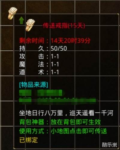 传送戒指刚刚出来的时候,大家都不知道其真正的用处,就把它随意转让给了一位散人,但是这位玩家却研究出其用法,抢先攻略当时相当危险的赤月地图,他也利用得到的资源发展起来,成为区里最富有的玩家之一。