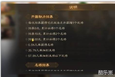 1、首先,在萌新专属的限时开疆助力卡池中,保底机制比较特殊,分别为第五次、第十五次,以及第三十次三次保底,每次触发保底都会抽到至少一名橙色武将,也就是说三十抽保底就能有三橙将,但卡池次数有限制,抽完之后这个卡池就会消失。
