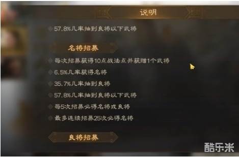 2、而在常驻的名将招募卡池中,保底机制分为两种,分别为单独5连抽保底获得良将的小保底,以及抽满25次,就必定会抽到一名橙色名将的大保底。考虑到名将包每天都会送一个免费单抽,因此即便不用金铢,每25天都能触发一次大保底。