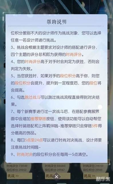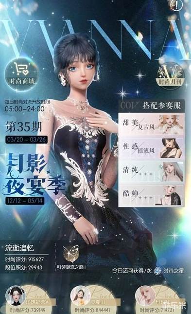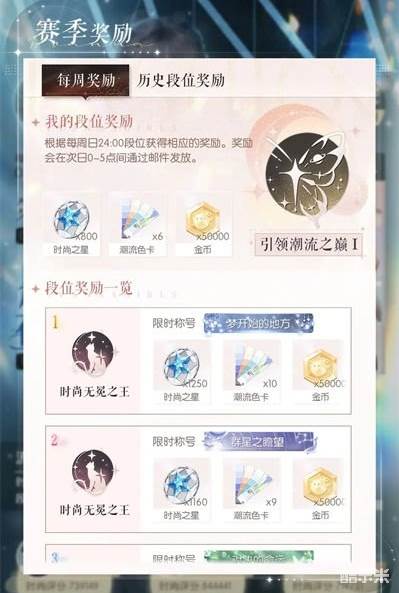 每星期1期,要求搭配4套衣服,通过总分的高低来排名(你总分比别人高就可以踩别人下去,没别人高就被踩排名一直掉)。这4套除了主风格外还会要求标签。一般出了限定5星6星,下周主风格和标签就是和限定一样(逼人氪金?)萌新劝退,整个游戏最让人火大的玩法,又涉及到6星套装不得不打。每天结算一次排名奖励,每周结算一次季赛奖励。