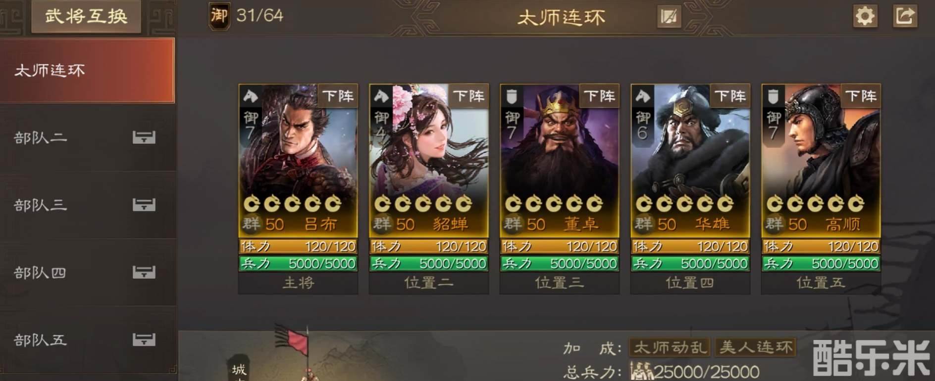 1、推荐阵容:吕布+貂蝉+董卓+华雄+高顺;