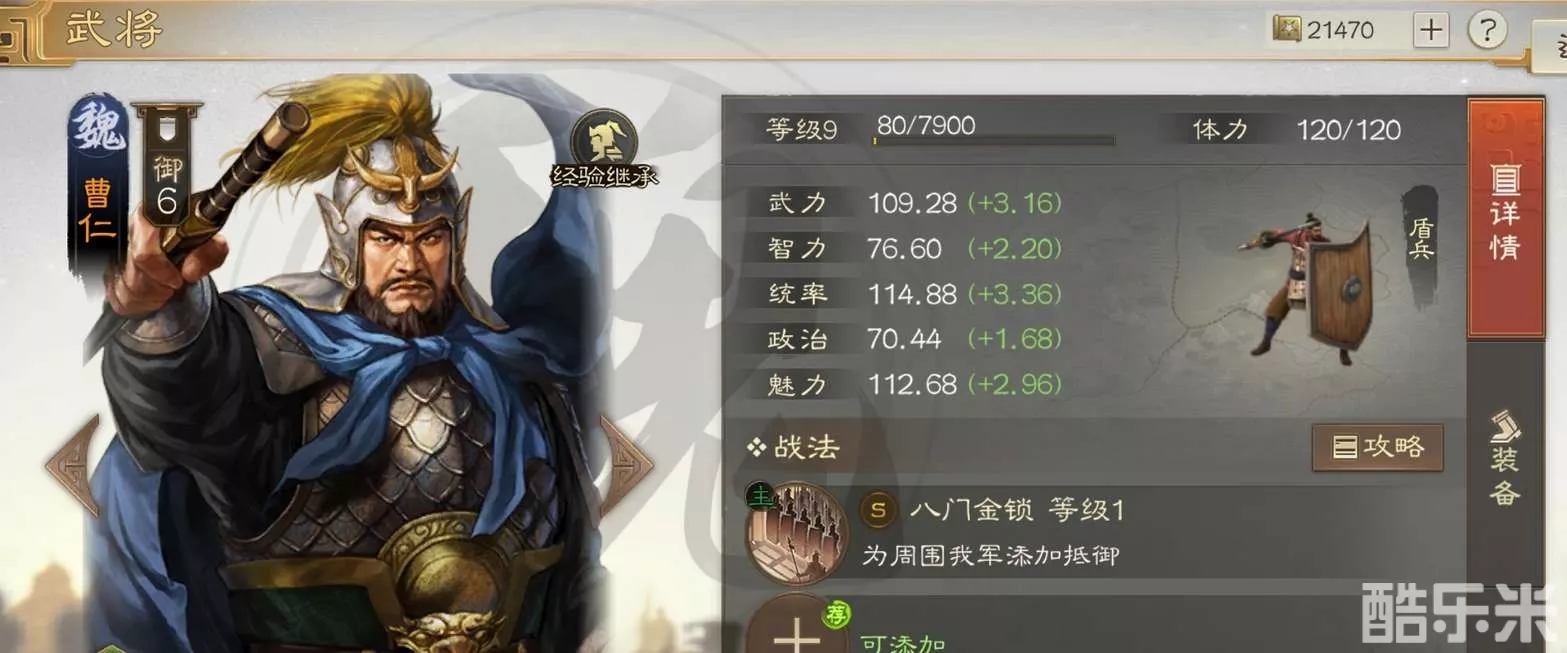 5、曹仁,金色武将,战法可以给范围内队友提供抵御效果,被动还可以增加免伤,坦度很高。