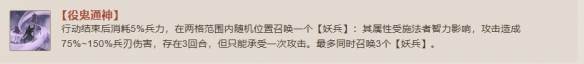 行动结束后消耗5%兵力,在两格范围内随机位置召唤一个【妖兵】:其属性受施法者智力影响,攻击造成75%~150%兵刃伤害,存在3回合,但只能承受一次攻击。最多同时召唤3个【妖兵】。