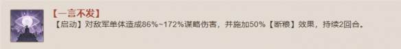【启动】对敌军单体造成86%~172%谋略伤害,并施加50%【断粮】效果,持续2回合。