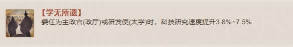 委任为主政官(政厅)或研发使(太学)时,科技研究速度提升3.8%~7.5%