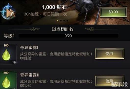 第四技能为主动技,需要使用斑点切叶蚁达到20级180000蜜露、并不需要变异孢子,只需要7个蓝色特化蚁残壳。技能解锁后可以手动释放,随机忽的10000-30000湿土,但使用后需要冷却22小时。