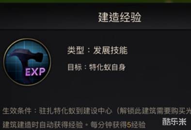 1.阿塔切蚁是辅助建筑的特化蚁,主要技能为建造经验技能,目标为阿塔切蚁自身,将阿塔切蚁驻扎到建设中心中,建筑建造时将自动获得每分钟5点经验,升满级后建筑建造时自动每分钟获得50点经验。