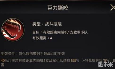 使用巨力撕咬技能可以造成155%伤害,很多后排射手蚁会被一击毙命。死不松口技能有效距离更是达到5,这个技能只能在第2、5、7回合释放,所以可以和巨力撕咬技能交替使用。