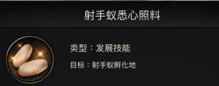6.射手蚁悉心照料技能,技能目标为射手蚁孵化地,驻扎后射手蚁孵化速度提升6%。射手蚁悉心照料技能满级后射手蚁孵化速度提升60%。
