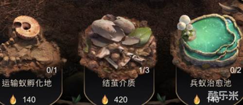 兵蚁治愈池——有治愈效果的菌丝池,可以帮助受伤的兵蚁恢复。提升兵蚁治愈池的等级可以提升治愈池接纳受伤兵蚁的容量。最多可建造8个。