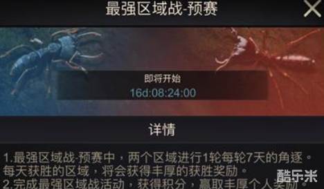 区域在第一次开启最强区域战时,为预选赛,持续1-2轮,每轮为期7天。前五日都会出现由系统固定安排的主题任务;第六天的主题任务可由统领在众多主题中自行选择感兴趣的主题任务;第七天的主题任务是镇压土拨鼠、野怪培养。