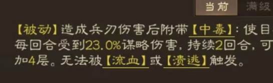 该战法属于被动类型,只要有伤害就能触发中毒,普攻和技能都算在其中,中毒之后目标将在持续两个回合里,每回合都受到谋略伤害。该效果还是可以叠加起来的类型,最多能叠加到4层,所受到伤害自然也同样往上提升。虽然看似单次并不高,但叠加起来计算总量之后就变得非常可观。