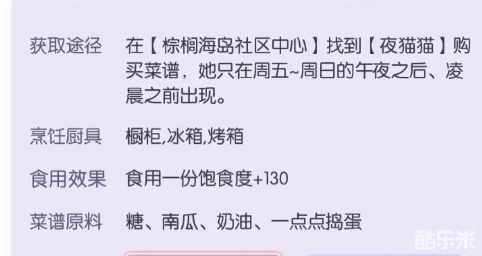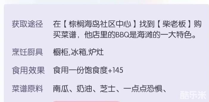 1、沙滩中有三个可以购买的菜谱。其一是BBQ店的柴老板处的惊魂南瓜汤