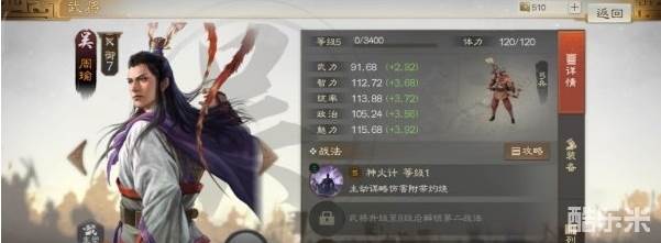 【被动】主动谋略伤害会对目标额外造成17%~34%谋略伤害(额外伤害不触发任何战法效果),并附带2回合【灼烧】:每回合受到17%~34%谋略伤害,可叠加;若为单体伤害则造成34%~68%额外伤害和两层【灼烧】。