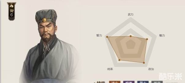 特性上有两个服务于内政,两个用于战斗的,前者能够提升铜币36的产量和自身1.21%的谋略,后者则提升附近友军的智力以及自身的免伤。