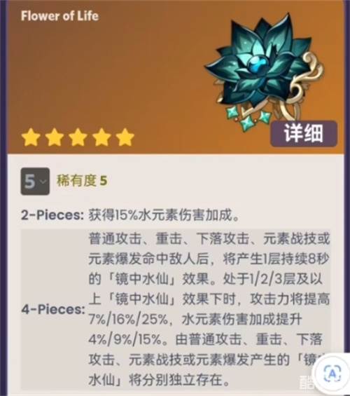 2、水仙之梦4件套效果:普攻、重击、下落攻击、元素战技或元素爆发命中敌人后会获得「镜中水仙」效果,1/2/3层及以上效果将获得7%/16%/25%攻击力提升以及4%/9%/15%水元素伤害提升;