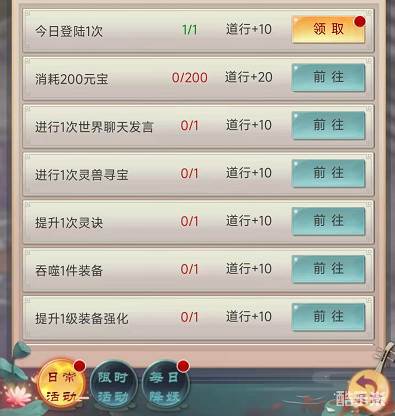 日常任务的完成奖励也是元宝获取方式的一种,日常任务可以于日常菜单中查看,完成每一个任务都可以获得道行,累积达到一定量级的道行后即可获得元宝。