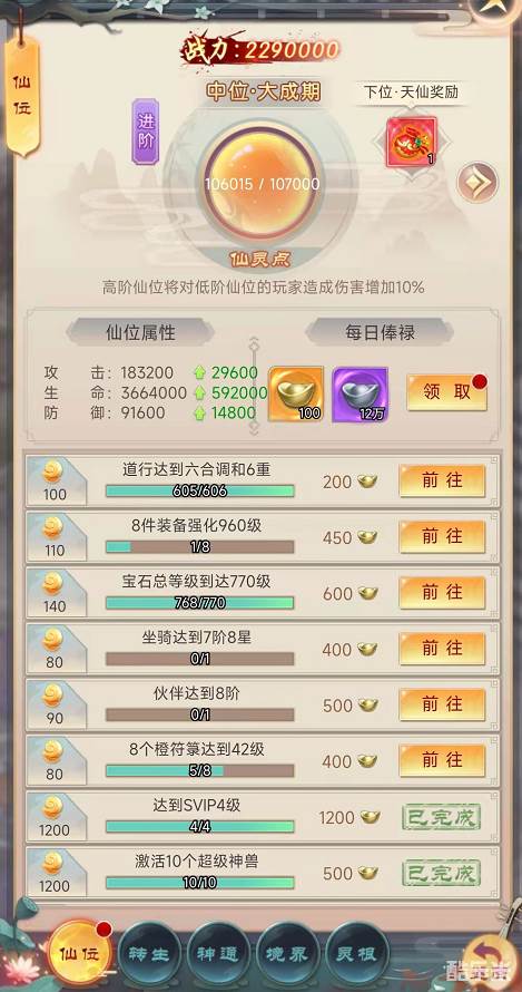 仙位系统位于左下角的鸿蒙之路菜单中,每提升一品仙位都能够获得角色攻击、生命及防御的永久加成。除此之外,玩家还可以根据自己的仙位领取相对应的每日俸禄,其中便包含了元宝。玩家的仙位越高,每日能获得的元宝便越高。