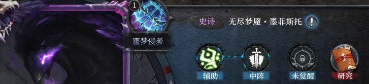 和其它技能不同,无尽梦魇的研究技能:窒息之阵必须消耗墨菲斯托和灵魂之曲才能解锁,效果如下:第一回合开始后,使随机两名敌方英雄各有41%陷入禁锢状态,持续两回合;第二回合开始时,使全体敌方各有41%概率降低基础攻击10%。