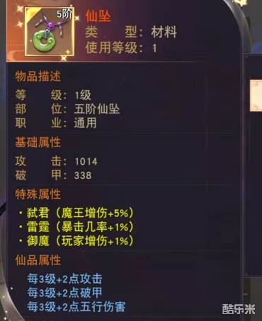 小编先来介绍一下仙坠,仙坠是一种材料,仙坠的等级并不高是一级材料,是五阶仙坠,五阶仙坠适用于所有的职业,也叫通用仙坠,五阶仙坠的基础属性包含攻击力达到1014,破甲达到338,仙坠也有特殊属性,弑君魔王增加伤害百分之五,雷霆暴击几率增加百分之一,御魔玩家增伤百分之一,该种仙品的属性特点是每三级增加两点攻击力,每三级增加两点破甲,每三级增加两点五行伤害,仙坠的获取途径暂时就一种,就是在传奇项链中进行获取。