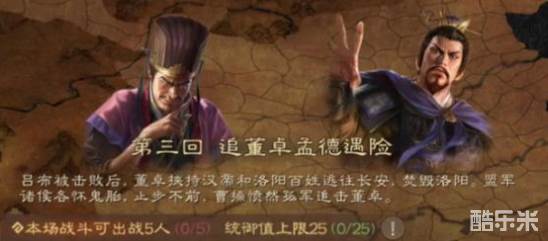 第三关“追董卓孟德遇险”,也是来自典故,曹操追击董卓大败而归。曹操对盟军诸侯的各怀鬼胎感到愤怒,孤军追击董卓,但大败而归。这一关我们的任务目标是追击敌军,不能让敌军逃脱数量高于一队,如果想要达到完胜,就不能让任何敌军逃脱。