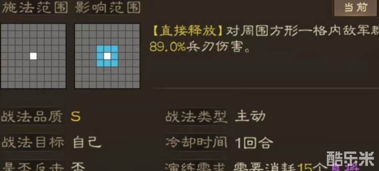 该战法属于s级品质主动类型,使用之后有一回合冷却时间。施法范围比较近是很遗憾的地方。使用之后效果是对一格以内敌军目标造成兵刃伤害,达到满级时比例为178%。虽然在伤害比例上不属于顶尖数值,但是好在伤害目标比较多,如果能找到人多的地方释放,最终输出量很恐怖,当然这也需要良好的武力属性作为基础。
