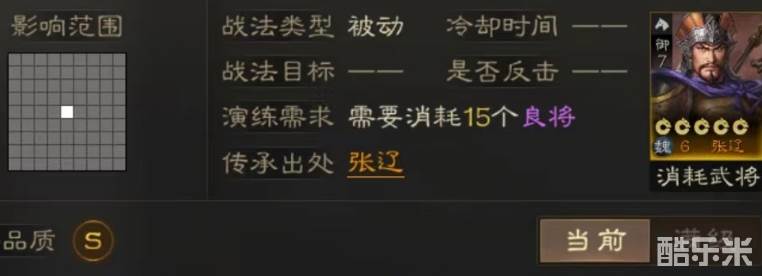 还有伤害提升效果,满级时数值为16%,也很可观,如果攻击目标处于孤立状态,则伤害再次提升。孤立状态指的就是对方周围没有队友。在攻击的时候对方要达到指定位置,如果过于靠前突出,就能利用战法所带来的伤害提升造成强力打击。在搭配上小编认为张辽自身是最合适人选,当然这需要多抽几张卡牌后才能实现。在自带战法影响下已经获得了先攻状态,不会受到反击,再加上必中,使张辽攻击变得极其犀利,而且对孤立下敌军,两大技能都有加成。